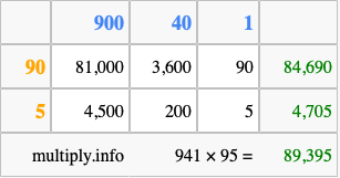 Below is an illustration showing you how to calculate 941 times 95 using the box method, using the instructions above.