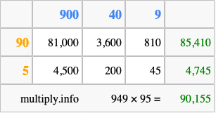 Below is an illustration showing you how to calculate 949 times 95 using the box method, using the instructions above.