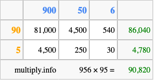 Below is an illustration showing you how to calculate 956 times 95 using the box method, using the instructions above.