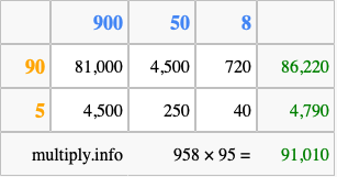 Finally, we add up all the sums we found in step 3 to get our final answer to 958 times 95.