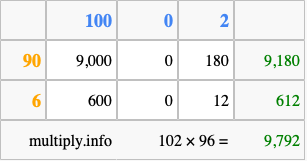 Below is an illustration showing you how to calculate 102 times 96 using the box method, using the instructions above.