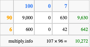 That's all there is to it! As you can see from the box above, the answer to 107 times 96 using the box method is 10,272.