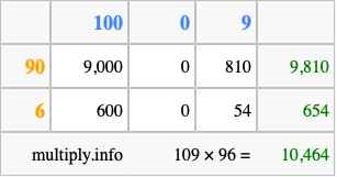 That's all there is to it! As you can see from the box above, the answer to 109 times 96 using the box method is 10,464.