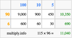 Below is an illustration showing you how to calculate 115 times 96 using the box method, using the instructions above.