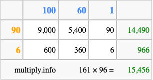 Below is an illustration showing you how to calculate 161 times 96 using the box method, using the instructions above.