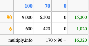 Below is an illustration showing you how to calculate 170 times 96 using the box method, using the instructions above.