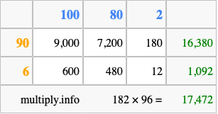 Below is an illustration showing you how to calculate 182 times 96 using the box method, using the instructions above.