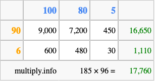 Finally, we add up all the sums we found in step 3 to get our final answer to 185 times 96.