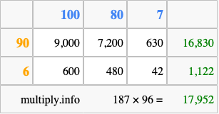That's all there is to it! As you can see from the box above, the answer to 187 times 96 using the box method is 17,952.