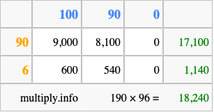 Below is an illustration showing you how to calculate 190 times 96 using the box method, using the instructions above.