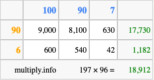 Below is an illustration showing you how to calculate 197 times 96 using the box method, using the instructions above.