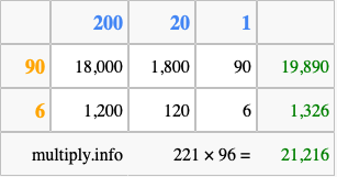 Finally, we add up all the sums we found in step 3 to get our final answer to 221 times 96.