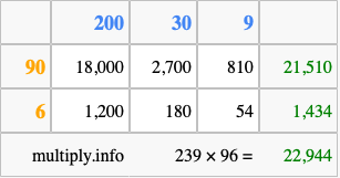 That's all there is to it! As you can see from the box above, the answer to 239 times 96 using the box method is 22,944.