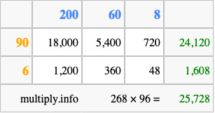 Finally, we add up all the sums we found in step 3 to get our final answer to 268 times 96.