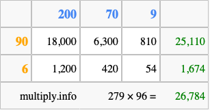 That's all there is to it! As you can see from the box above, the answer to 279 times 96 using the box method is 26,784.