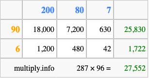 That's all there is to it! As you can see from the box above, the answer to 287 times 96 using the box method is 27,552.