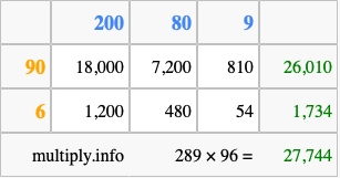 That's all there is to it! As you can see from the box above, the answer to 289 times 96 using the box method is 27,744.
