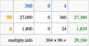 Below is an illustration showing you how to calculate 304 times 96 using the box method, using the instructions above.