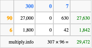 That's all there is to it! As you can see from the box above, the answer to 307 times 96 using the box method is 29,472.