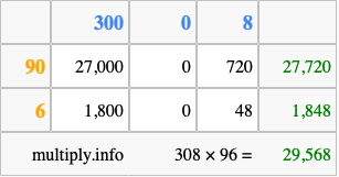 Below is an illustration showing you how to calculate 308 times 96 using the box method, using the instructions above.