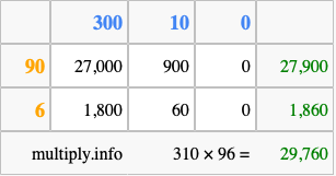 Below is an illustration showing you how to calculate 310 times 96 using the box method, using the instructions above.