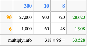 Below is an illustration showing you how to calculate 318 times 96 using the box method, using the instructions above.