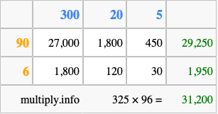 Finally, we add up all the sums we found in step 3 to get our final answer to 325 times 96.
