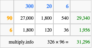 Below is an illustration showing you how to calculate 326 times 96 using the box method, using the instructions above.