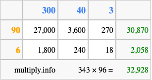 Finally, we add up all the sums we found in step 3 to get our final answer to 343 times 96.