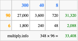 Below is an illustration showing you how to calculate 348 times 96 using the box method, using the instructions above.
