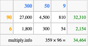 Finally, we add up all the sums we found in step 3 to get our final answer to 359 times 96.