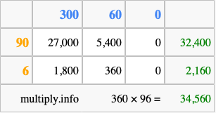 Finally, we add up all the sums we found in step 3 to get our final answer to 360 times 96.