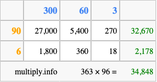 Finally, we add up all the sums we found in step 3 to get our final answer to 363 times 96.