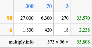 That's all there is to it! As you can see from the box above, the answer to 373 times 96 using the box method is 35,808.