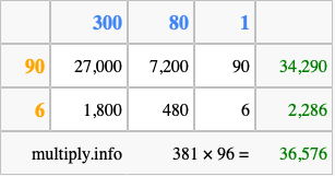That's all there is to it! As you can see from the box above, the answer to 381 times 96 using the box method is 36,576.
