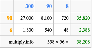 Below is an illustration showing you how to calculate 398 times 96 using the box method, using the instructions above.