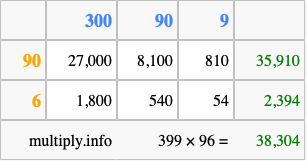 Finally, we add up all the sums we found in step 3 to get our final answer to 399 times 96.