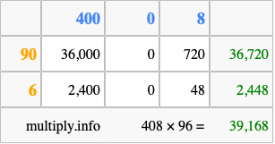 Finally, we add up all the sums we found in step 3 to get our final answer to 408 times 96.