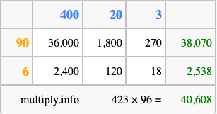Finally, we add up all the sums we found in step 3 to get our final answer to 423 times 96.