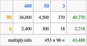 Below is an illustration showing you how to calculate 453 times 96 using the box method, using the instructions above.