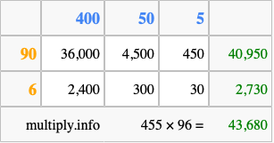 Below is an illustration showing you how to calculate 455 times 96 using the box method, using the instructions above.