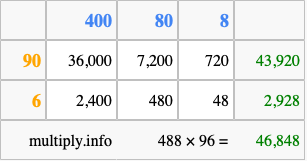 Finally, we add up all the sums we found in step 3 to get our final answer to 488 times 96.