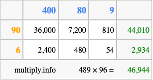 That's all there is to it! As you can see from the box above, the answer to 489 times 96 using the box method is 46,944.