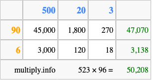 Below is an illustration showing you how to calculate 523 times 96 using the box method, using the instructions above.