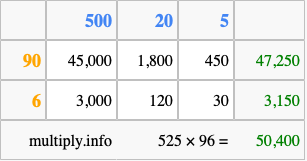 Below is an illustration showing you how to calculate 525 times 96 using the box method, using the instructions above.