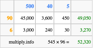 Finally, we add up all the sums we found in step 3 to get our final answer to 545 times 96.