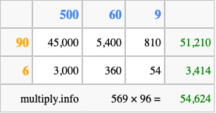 That's all there is to it! As you can see from the box above, the answer to 569 times 96 using the box method is 54,624.