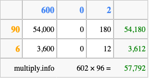 That's all there is to it! As you can see from the box above, the answer to 602 times 96 using the box method is 57,792.