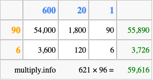 Below is an illustration showing you how to calculate 621 times 96 using the box method, using the instructions above.