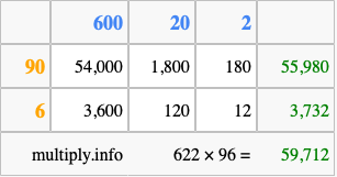 Below is an illustration showing you how to calculate 622 times 96 using the box method, using the instructions above.